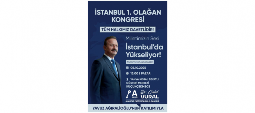 Anahtar Parti Ümraniye İlçe Başkanı Tekin Yılmaz, 5 Ekim 2025 Pazar günü saat 13.00’te Yahya Kemal Beyatlı Gösteri Merkezi’nde gerçekleştirilecek İstanbul 1. Olağan Kongresi için coşkulu bir davette bulundu.